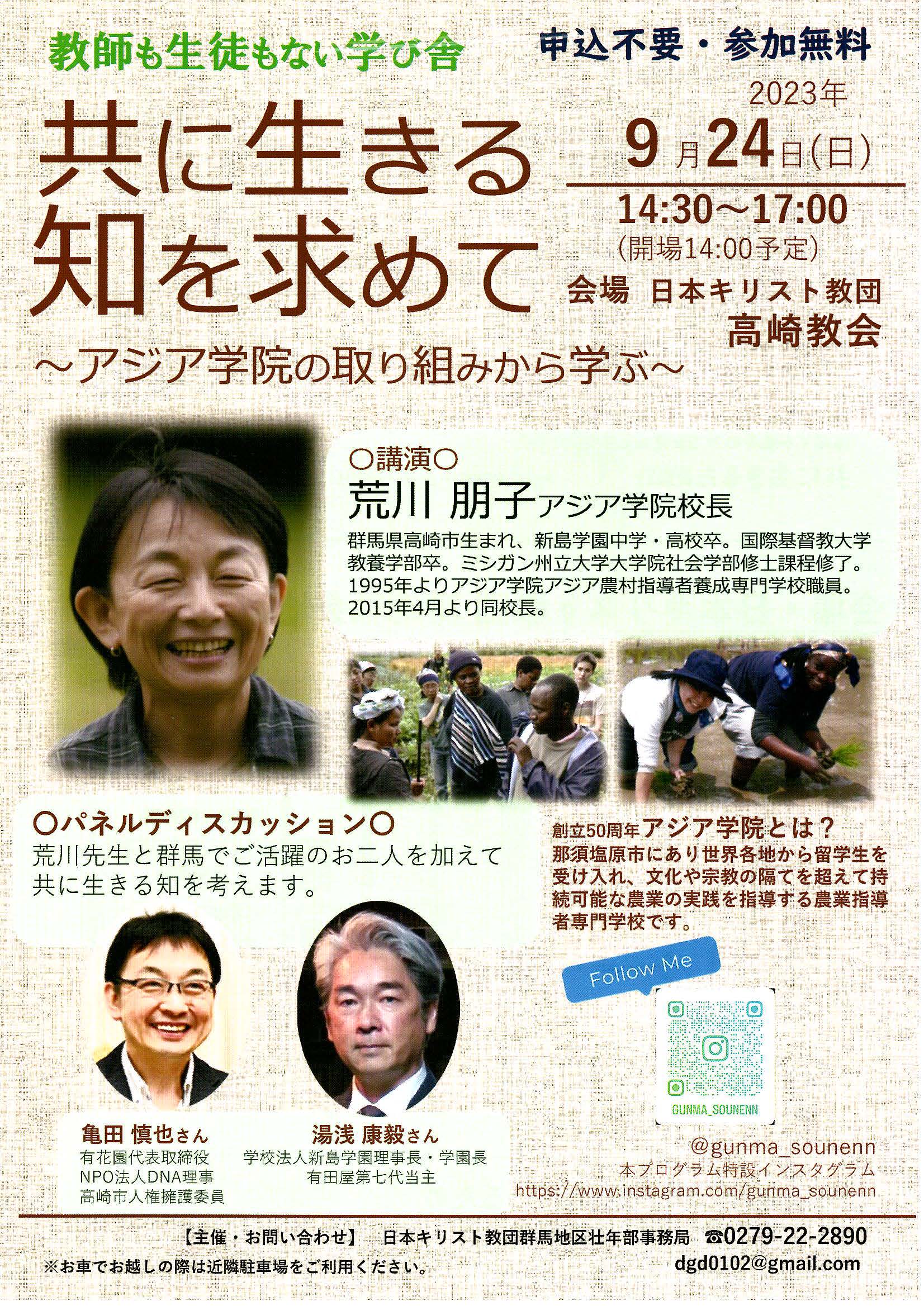 校長荒川朋子高崎講演「教師も生徒もない学び舎 共に生きる知を求めて~アジア学院の取り組みから学ぶ~」 2023/09/23 会場:日本基督教団高崎教会 日時:9/24(日)14:30-17:00 (開場14:00予定)。