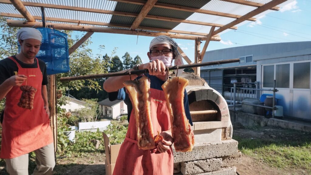 小出さんが、早朝に屋外で乾燥させ燻製にしたベーコンを使い、ベーコンの加工について説明して頂きました。その後、学生達は、出来上がっていくベーコンの燻製の過程を見て拍手を送り、興奮した様子でした。