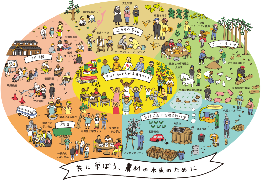 パンフレットにも使われたアジア学院コミュニティメンバーたちのかわいいイラストをふんだんに用いて、アジア学院の未来図、卒業生の活動、アジア学院の歴史などのストーリーがわかりやすく描き出されています。