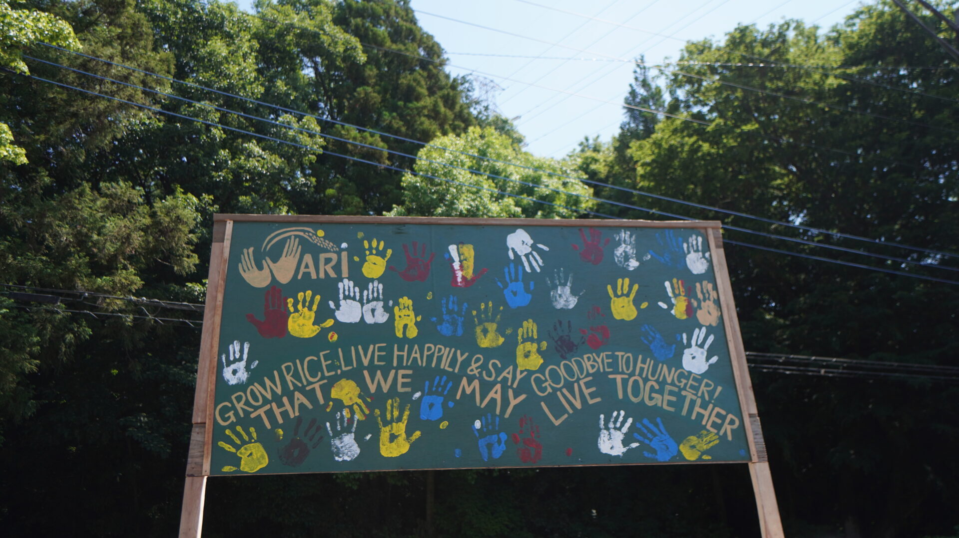 今年の田植えのテーマは「Grow Rice, Live Happily and Say Goodbye to Hunger」。