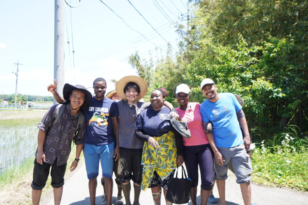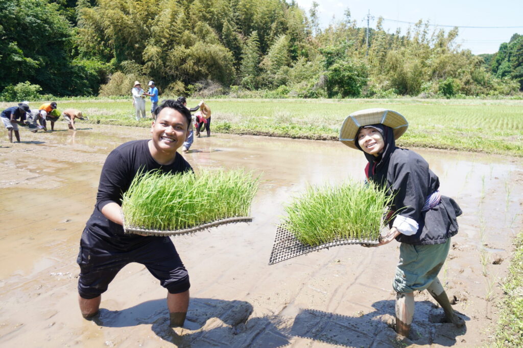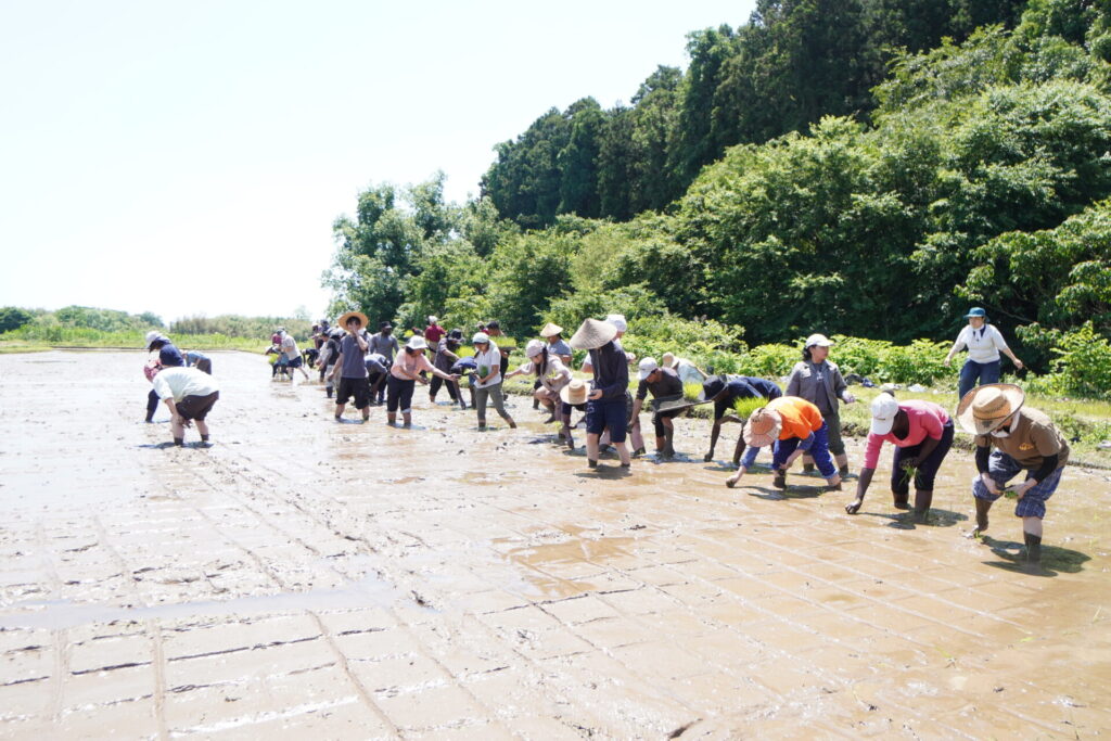 アジア学院では、毎年恒例の田植えを行いました。この日は晴天に恵まれ、参加者たちは音頭を取りながら、にぎやかに作業を進めていました。