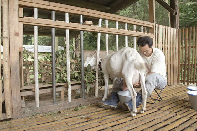 山羊のミルク(年間200リットル以上)や肉は食用に、糞尿は肥料に利用しています。山羊は日中は放牧場でのびのびと過ごします。