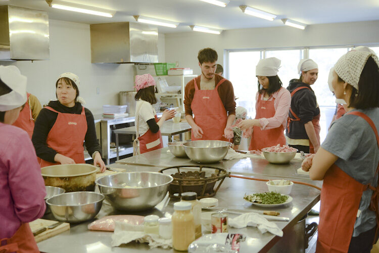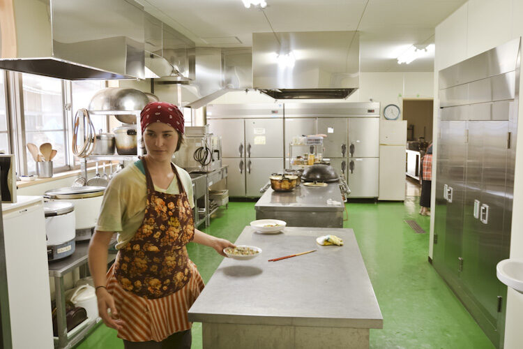 多い時で一度に100人分の食事を作ります。学生、職員、ボランティアは皆食事作りに参加します。学び、関係を深め、奉仕する場としてのキッチンを皆でつくり上げています。