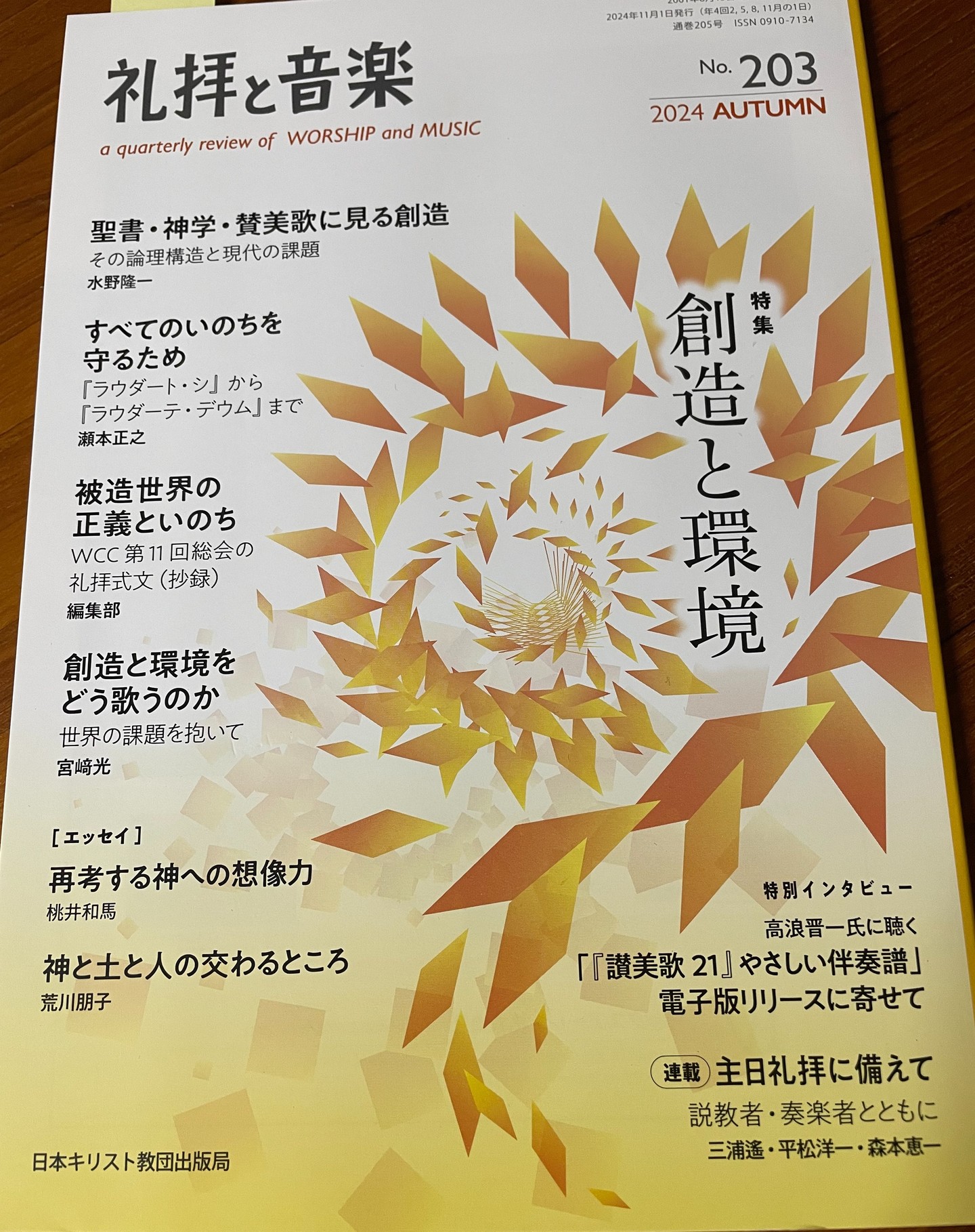 季刊「礼拝と音楽」第203号(日本キリスト教出版局 2024年10月発行)に「神と土と人の交わるところ」と題した私の文章が掲載されました。今号は「創造と環境」特集ということで、現場からのエッセイをとの依頼でした。アジア学院は神と土と人が交わる唯一無二の「環境」だと紹介し、その独特の環境の中で、「私たちは「人間同士ともに生きるための努力」を惜しまず、変革と創造とが豊かにのびやかに自由に行われていくことを願います」と結びました。多くの衝突、混乱、対立が同時多発的に起きているこの世の中で、このことを本当に切に願っています。