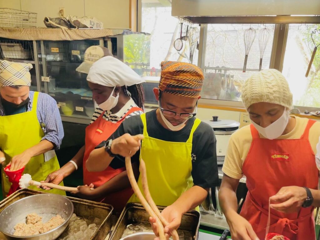 In groups, participants ground pork using hand cranks, diced vegetables, and mixed seasonings. Through it all, Koide-sensei walked calmly, hands clasped behind his back—literally letting the participants be the ones with hands on. Everyone was diligent in cleaning as they went, fluidly trading roles to make for a sustainable learning process.