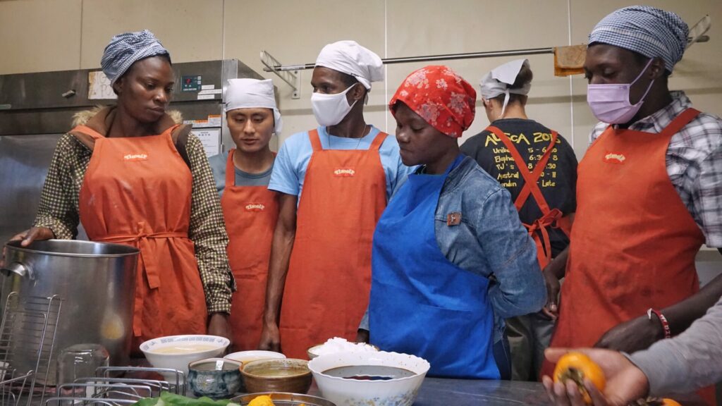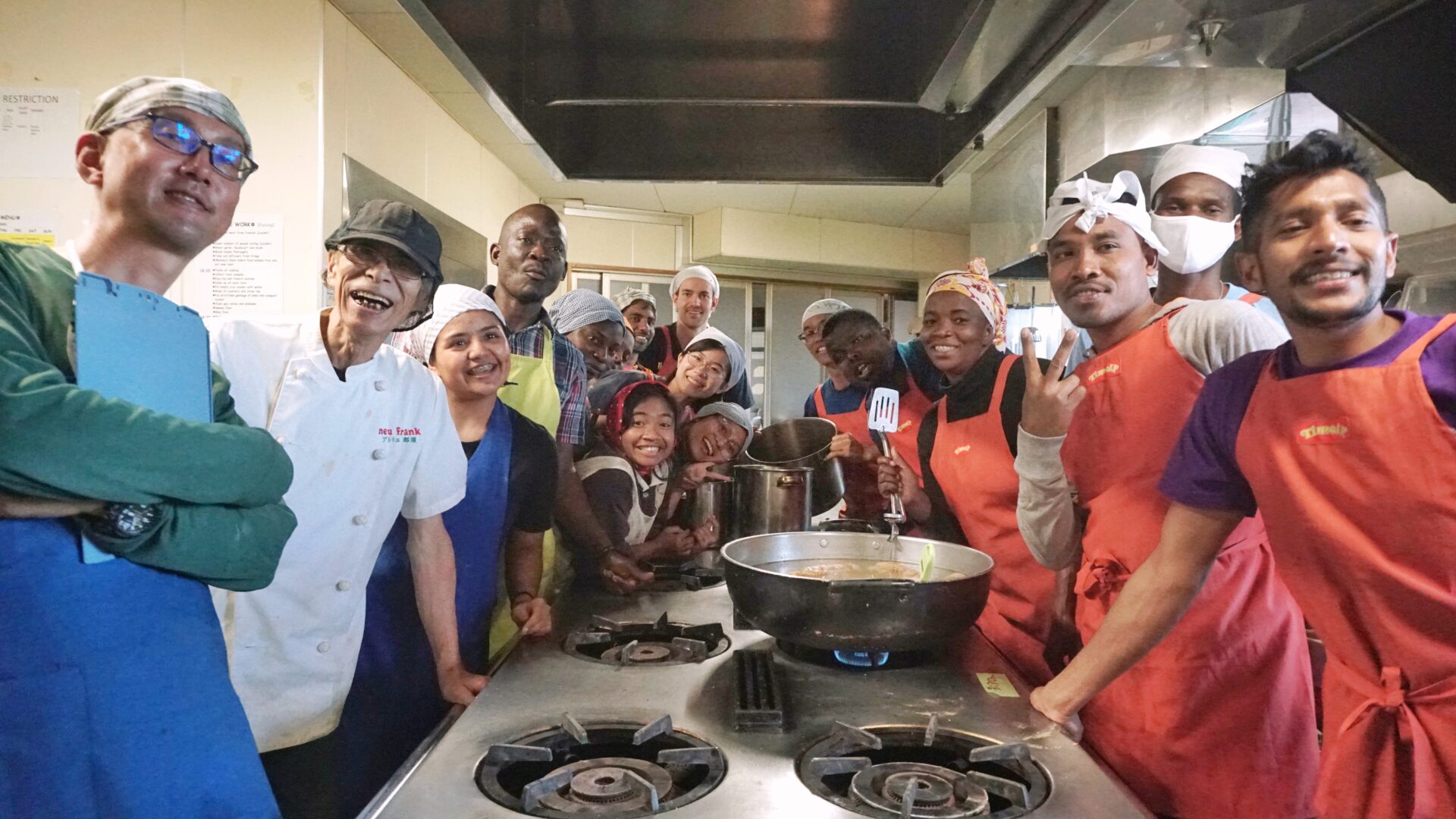 The class briefly left the kitchen when Mr. Hideo explained the processing of bacon with the sample which had already been dried and smoked outdoors early that morning. Participants clapped as they saw the bacon-smoking process complete, excited to be closer to the finishing line for bacon processing.