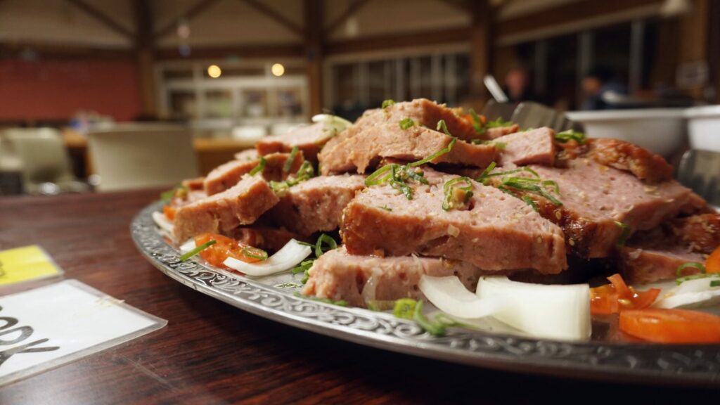 Mr. Hideo Koide from Neu Frank in Nasu returned shortly after the first class to continue teaching us how to process meat and produce bacon, jerky, tea ham (chashu), and meatloaf. On a sunny afternoon, Participants quickly assembled in the kitchen, eager for the lesson of the day. Mr. Koide started explaining the processing for each item, bowls of seasoning and ingredients laid out before him. Participants immediately got to task and worked hand in hand to prepare jerky and tea ham: chopping up garlic and onion, mixing various ingredients and seasoning, boiling water, etc.