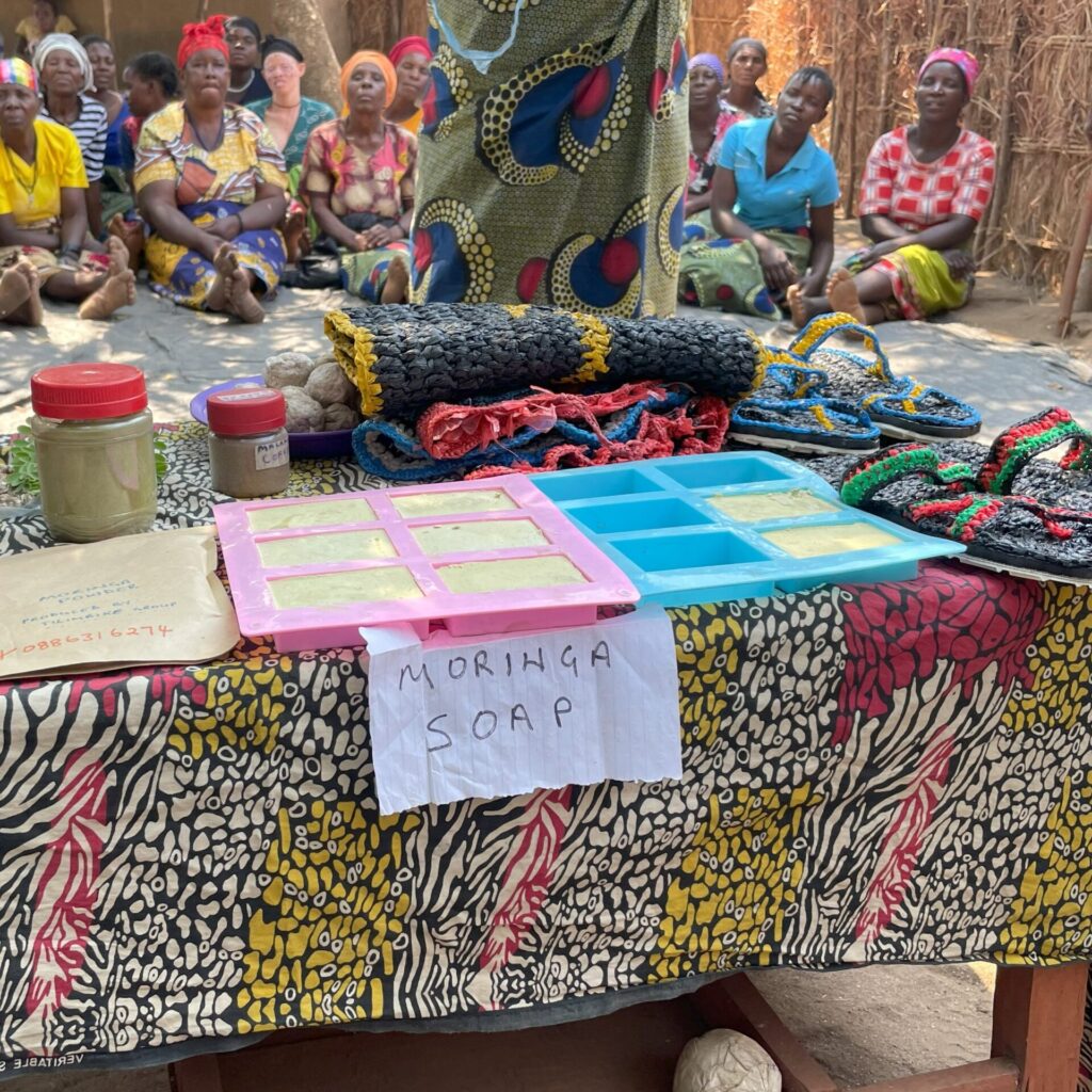 At one point during our meeting a table was brought out filled with goods made by the hands of the group members. These included moringa powder and baobab powder which the villagers themselves were explaining the benefits of. “It is good for malaria and for malnutrition and helps people with HIV.” There was also homemade soap, imbued with moringa. One girl explained that she used this when she had a skin problem (scabies), and it healed her. Hats and sandals made of woven plastic bags were on display – from trash to usefulness – and one lady was busily demonstrating how to weave the plastic. “We got this idea from the radio. They announced a phone number, and we called it to learn.” Two women were showing how to weave the grass mats that are so useful in the villages. I was told that all the products on display were available for sale. So, I took the hint and bought a lot of stuff to support their efforts. I especially love the soap.