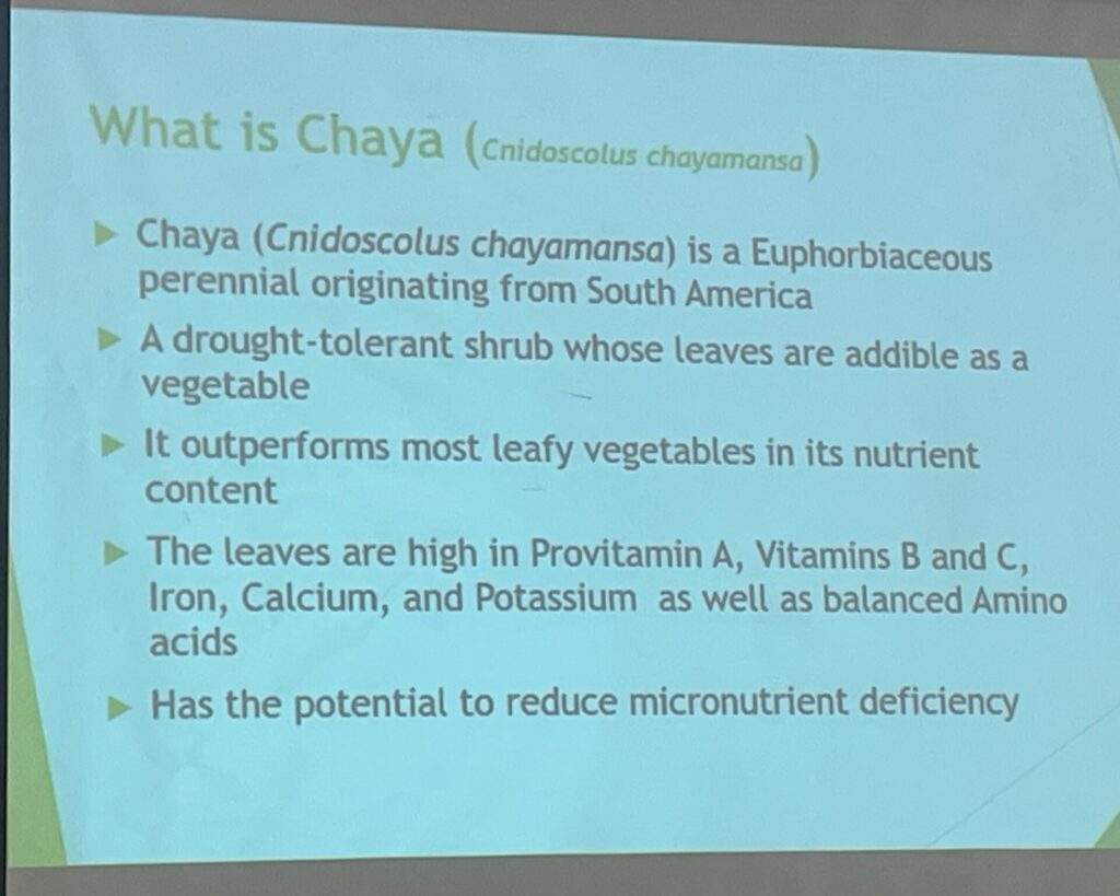 A small debate started when one audience member said they were afraid to eat Chaya because it contains toxins. This is true, it turns out, but only needs to be boiled first, just like spinach and casava. It’s better not to eat it raw, but even then, only great amounts consumed would have harmful effects.