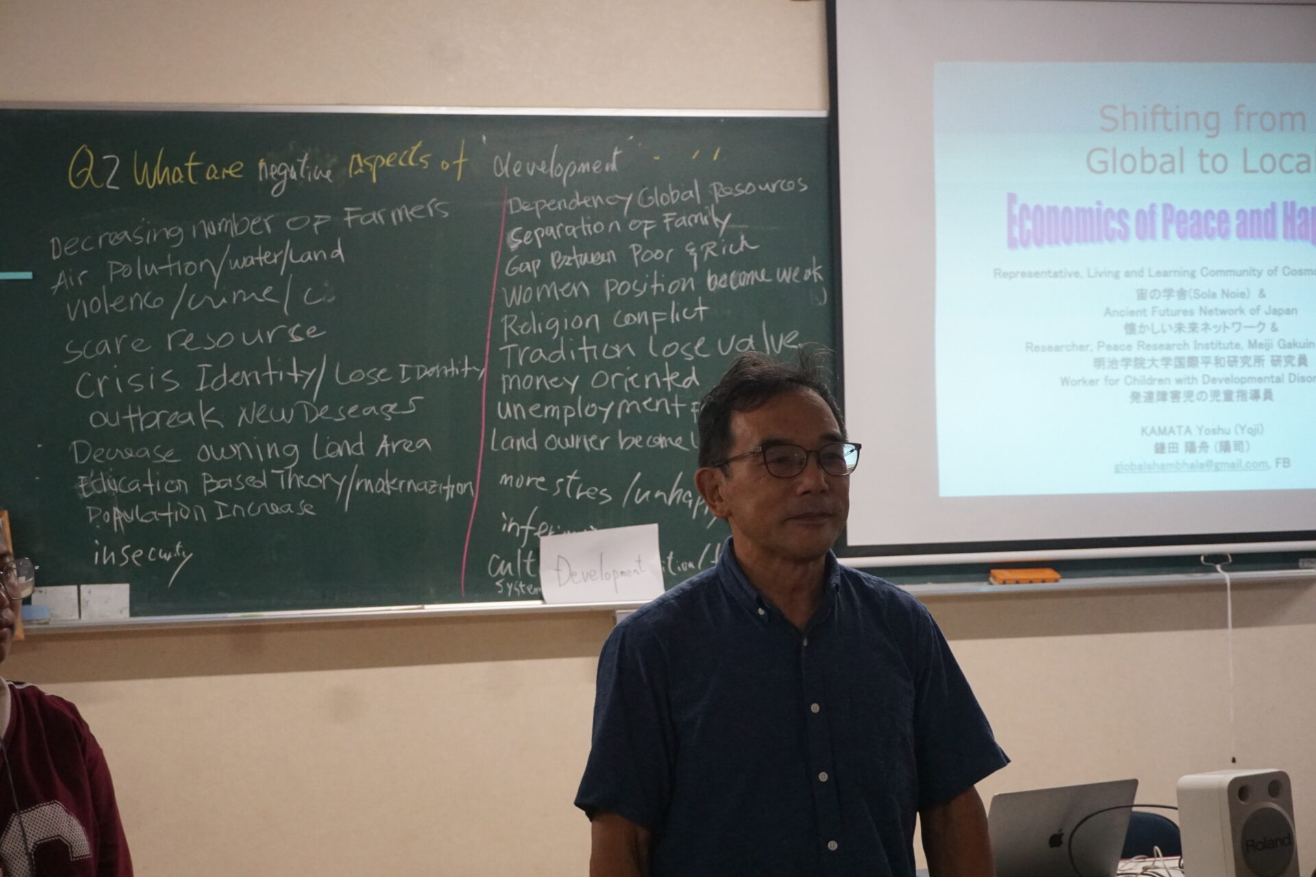 The session also highlighted the downsides of economic globalization, such as increasing insecurity, climate impact, and the waste of natural resources. Using the metaphor of a “leaking bucket,” Mr. Kamata explained how local economies lose strength when communities rely heavily on external goods and services. Items like fuel, machinery, and even imported education create “leaks” that drain economic resources from local communities.